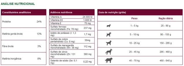 integral, 4% milho), carnes e subprodutos animais (4% vaca, 2% porco),
