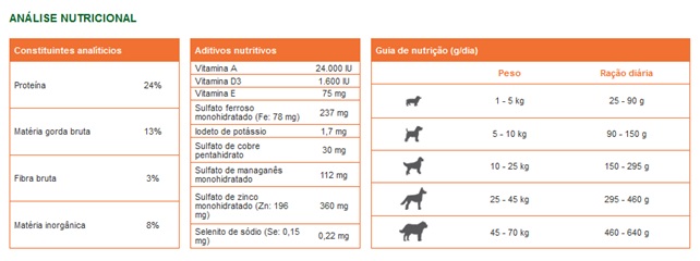 integral, 4% milho), carnes e subprodutos animais (5% aves, 2% cordeiro