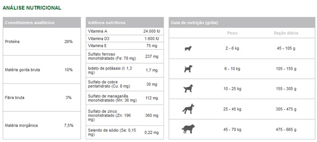 Cereais (4% trigo, 4% milho), carnes e subprodutos animais (4% Frango), subprodutos de origem vegetal, extractos de proteínas vegetais, óleos e gorduras, substâncias minerais.